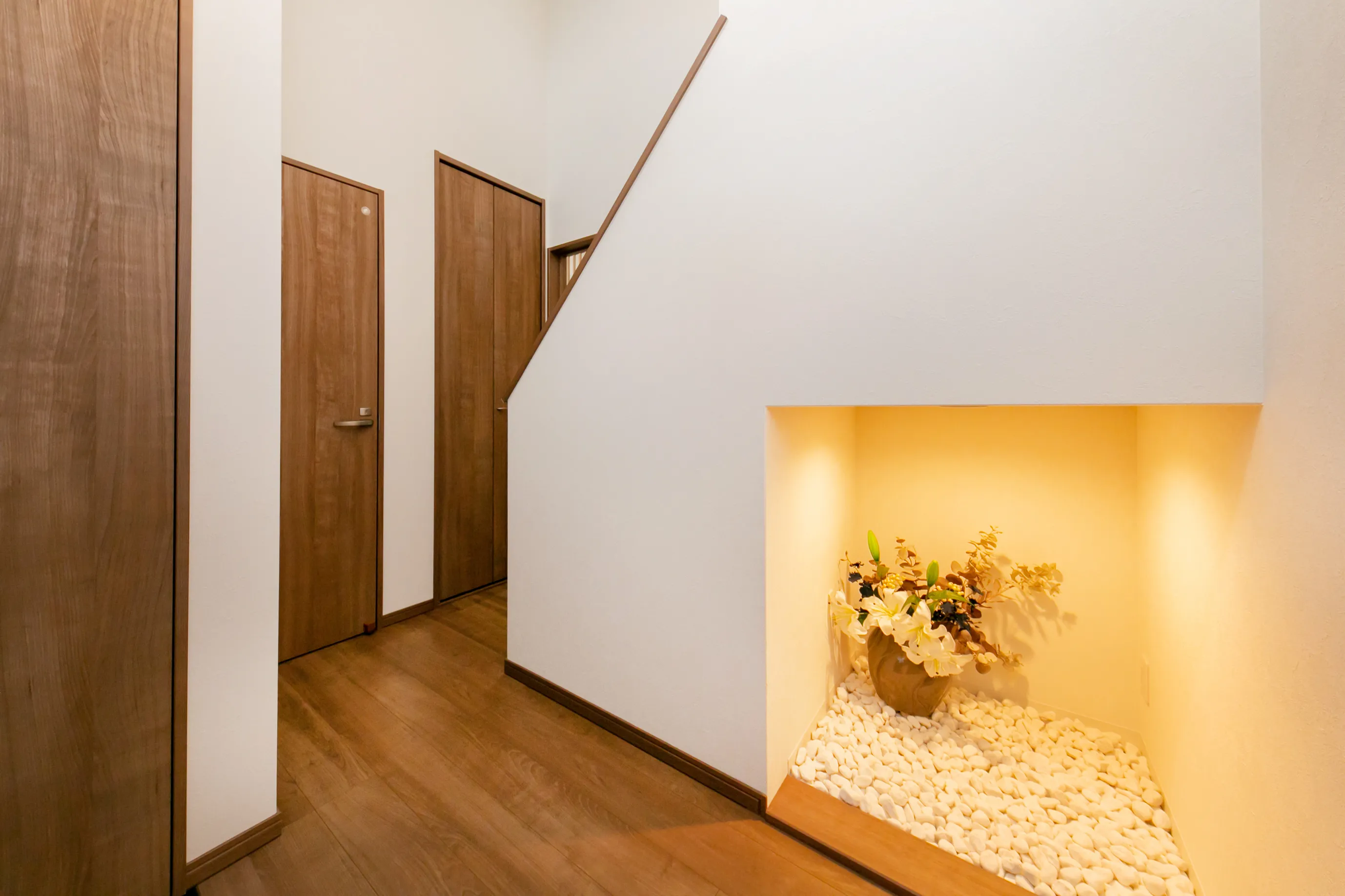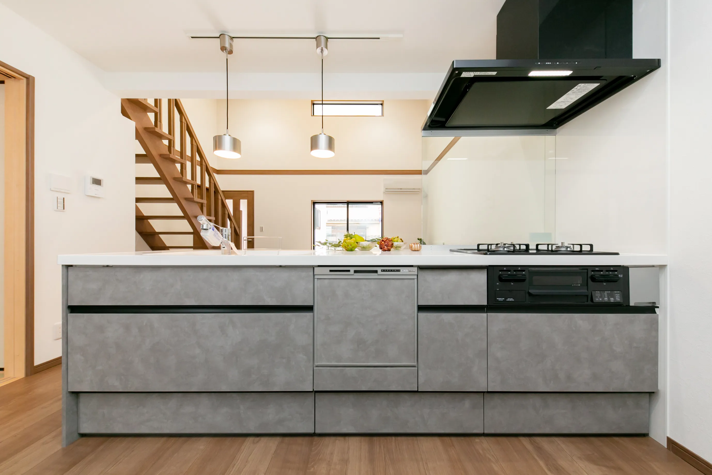 デザインと家事動線が響きあうホテルライクな暮らし 所在地 京都市右京区 家族構成 入居時期 建物面積 1F 52.80㎡ 2F 46.57㎡ 延床面積 99.37㎡ ロフト・収納階面積 13.05㎡ 合計 112.42㎡
