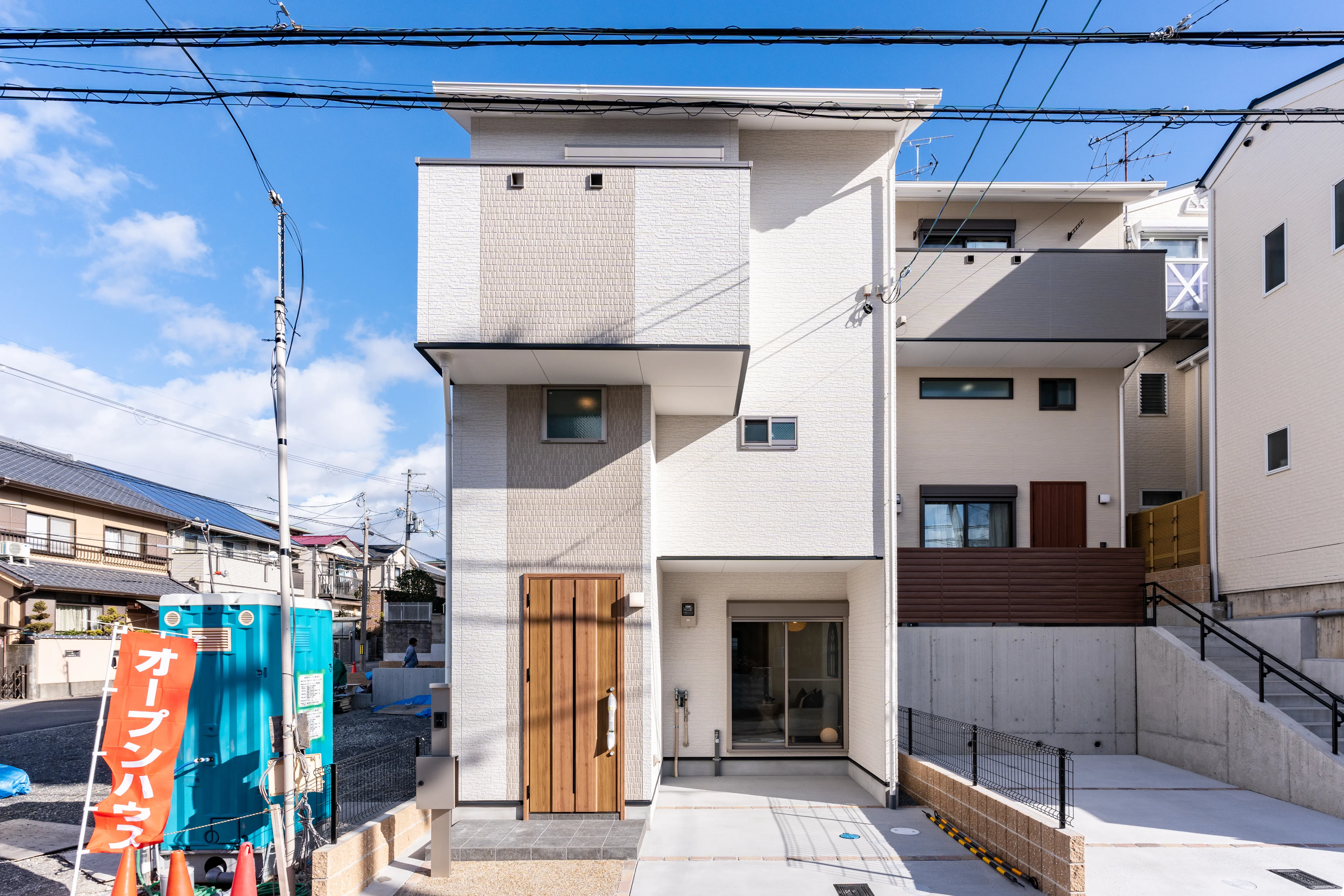 Wロフトのいえ 白が主役のキャンパスにグラフィカルな彩りを 所在地 京都市南区 家族構成 入居時期 建物面積 1F 36.26㎡ 2F 36.59㎡ 延床面積 72.85㎡ ロフト・収納階面積 30.34㎡ 合計 103.19㎡